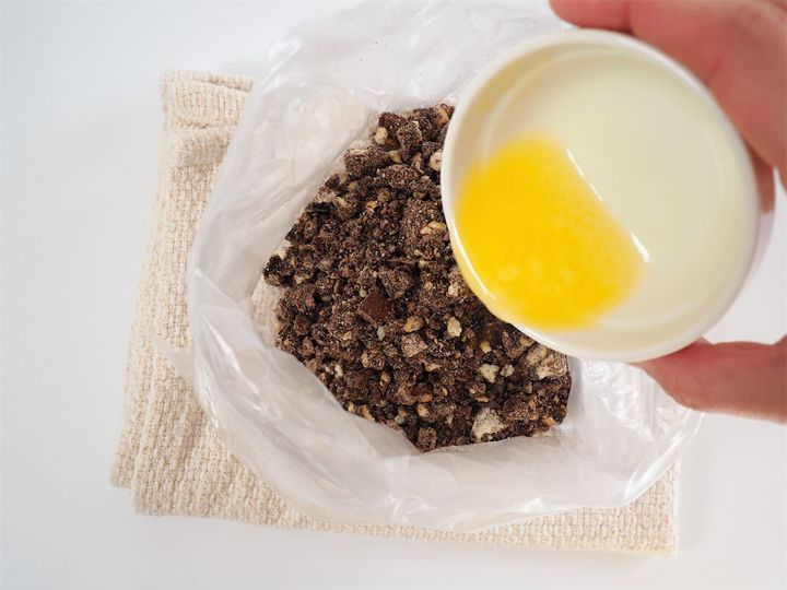 2. めん棒などでブラックサンダーを細かく砕き、ビニール袋に入れ、1を加えなじませる。