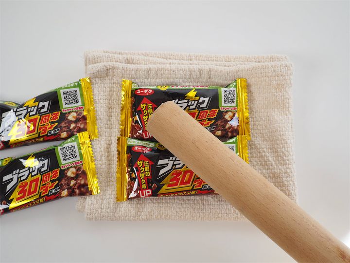 ブラックサンダーはパッケージに入ったまま砕きます。
