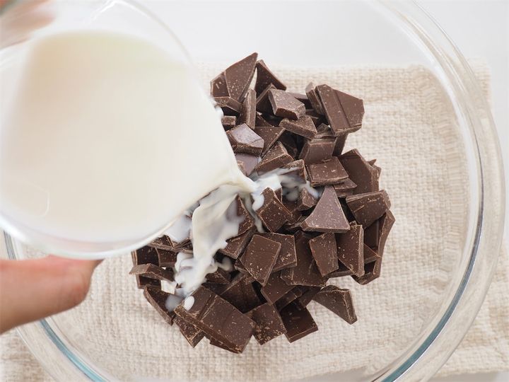 4. 耐熱ボウルに板チョコを砕き入れ、牛乳を加えたら電子レンジ600Wで1分半加熱する。