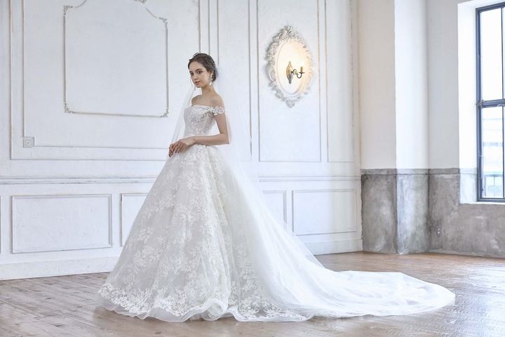 繊細なレースをふんだんに使用した一着。オフショルダーのあしらいやスカートのトリミングなど、随所にモダンなデザインを取り入れています。ドレス¥704,000[レンタル価格](イネス・ディ・サント/ギャレリアコレクション 銀座店 tel.03-5159-6362)