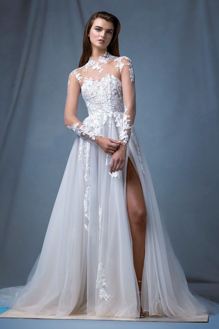 スタンドカラー、ロングスリーブのクラシックなデザインですが、イリュージョンレースを使用し、細みのAラインシルエットにすることでモダンな雰囲気を演出。ドレス¥605,000[レンタル価格](イネス・ディ・サント/ミラー ミラー 丸の内 tel.03-5220-0291)