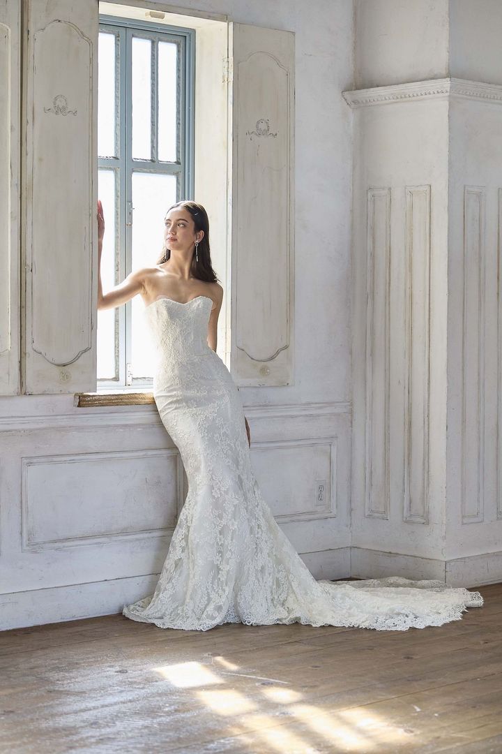 レースの質感を最大限に生かした、シンプルなマーメイドラインのドレス。胸もとのデザインや膝下のシルエットなど、クチュールのテクニックがふんだんに盛り込まれています。ドレス¥440,000[レンタル価格](イネス・ディ・サント/ギャレリアコレクション 銀座店 tel.03-5159-6362)