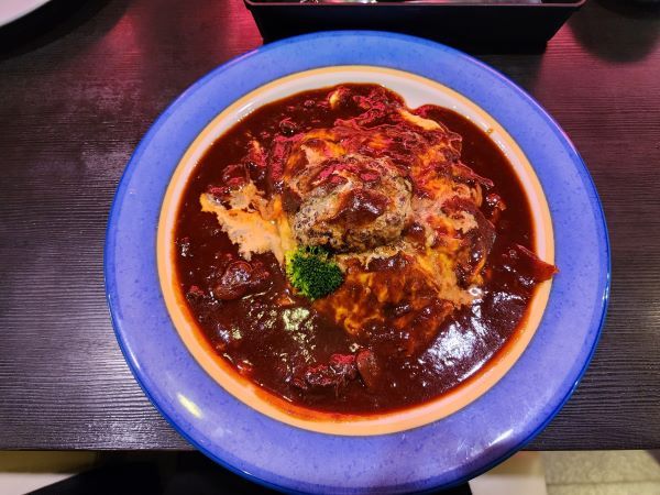 定番人気の「特薦ジャンボかつカレー」はじめ「選べるナポリタンセット」や「唐揚げ葱醤油風味定食」などなど種類豊富なメニューの中から、悩みに悩み抜いてやっぱりこの日もオーダーしました。「ふわとろ卵のハヤシライス~ハンバーグのせ~」