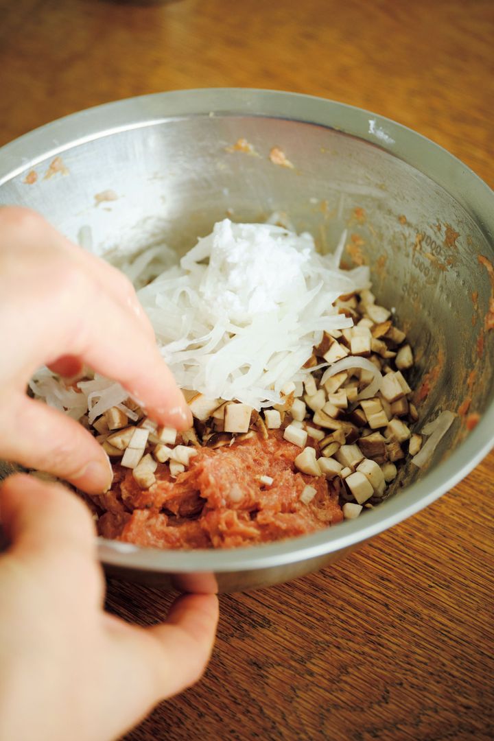 バットに小麦粉適宜を入れる。肉だねの材料をボールに入れ、手でよく練り混ぜる。細切りの大根、しいたけと、片栗粉小さじ1を加え、野菜に粉をさっとからめてから全体を均一に混ぜる。12等分に丸め、小麦粉のバットに加えて全体にしっかりとまぶす。