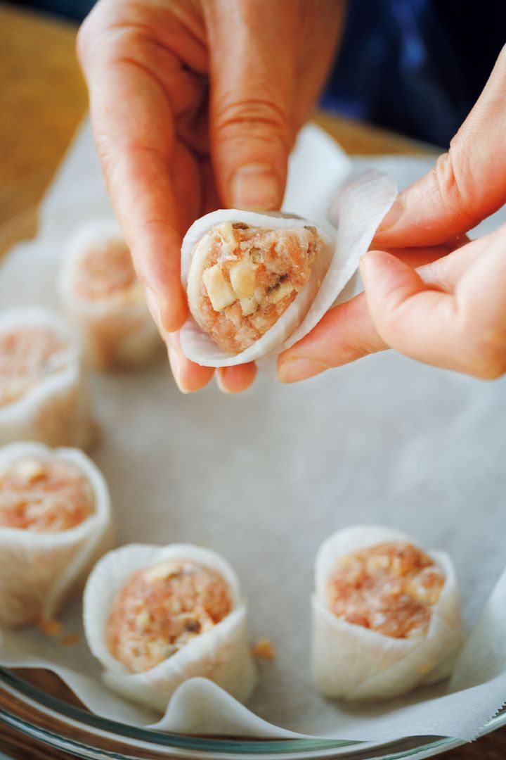 皮なしでつくる大根シュウマイ。薄切りにした大根を巻けば、まるで花びらのような華やかさに。たねにもたっぷり大根を加えて、軽やかに仕上げます。