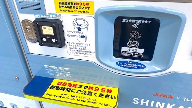 ちなみに、豆を挽いてコーヒー抽出を待っている間のBGMは、高速道路のSA・PAのミル挽き珈琲自販機では「コーヒールンバ」が流れますが、JR東海×ミル挽き珈琲コラボ機では、東海道新幹線の車内チャイムと同じ「会いにいこう」が流れます。