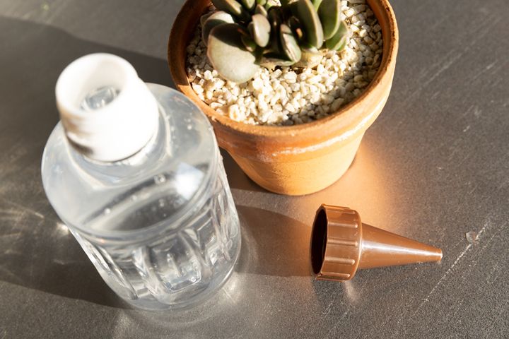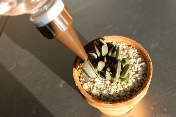 ちなみに、前出のシュルドティアヌスは、塊根部が濡れると蒸れの原因になるので、下の写真のようにノズルなどを使い、水が株にかからないように注意しましょう。