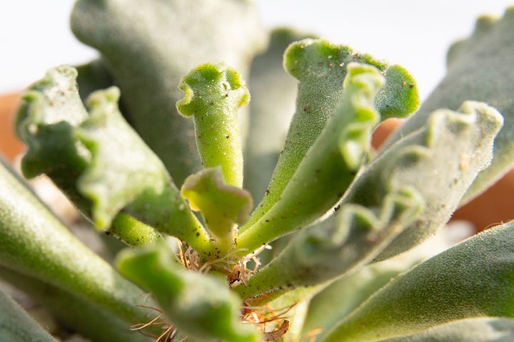 葉は厚みがあり、多肉植物らしい丸みを帯びた形状をしていて、パッド状、棒状、扇状、こん棒状と、葉姿のバリエーションの多さも魅力です。
