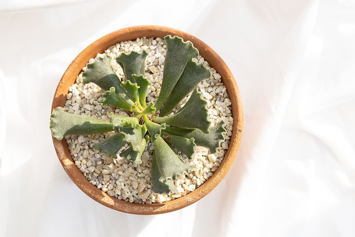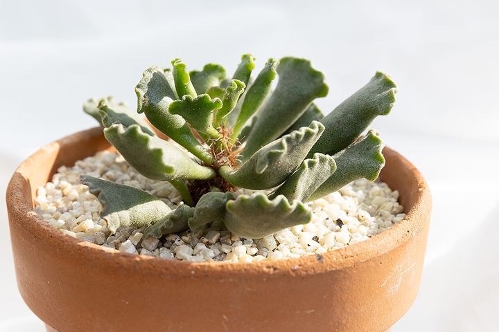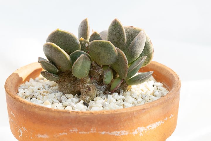 乾燥した土壌を好むアドロミスクスですが、根が干物のように乾燥しすぎるのもよくないので、土の排水性と保水性の微妙なバランスを整えてくれる素焼き鉢がおすすめです。