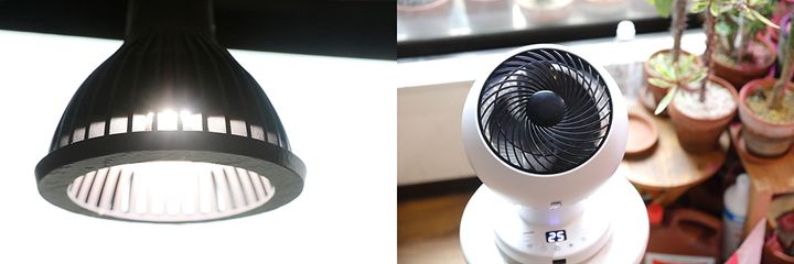 住環境でこれらが難しい場合は、太陽の代わりに植物育成LEDライト、自然の風の代わりにサーキュレーターで室内の空気を循環させることにより、適切な管理を行うことができます。