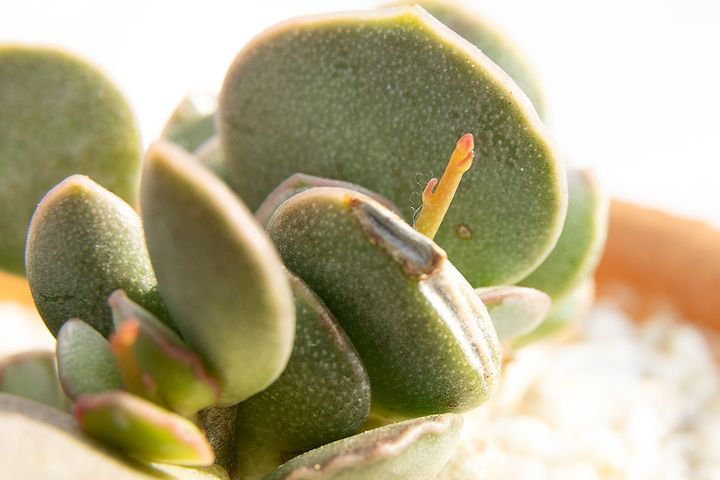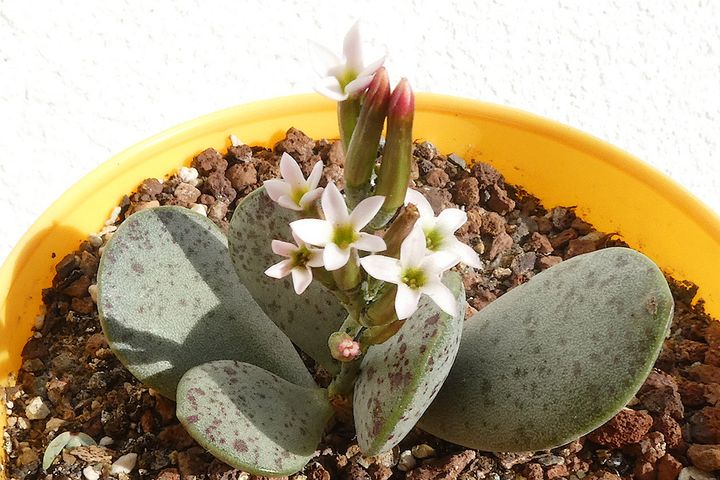 アドロミスクスは花も魅力的です。小さな花は株の中心から伸びる長い花茎に咲き、白や薄いピンク色が一般的で、とても可愛らしい印象です。