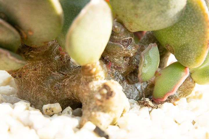 概要:シュルドティアヌスは、アドロミスクス特有の多肉質で複雑な彩りを魅せる葉と、基底に極太の塊根部を形成する独特な茎を持つ、とてもユニークな形状をした珍種。