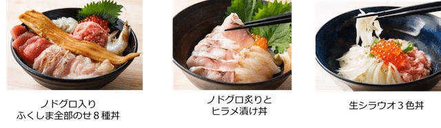 「かに船ふくしま海鮮丼」ブースの目玉メニューが、「常磐もの」と呼ばれる福島の魚介を贅沢に盛った「ノドグロ入りふくしま全部のせ8種丼」。白身のトロと呼ばれるノドグロの炙り、「常磐もの」の代表格のヒラメの漬け、葛尾村で陸上養殖された生エビ、この時期にしか味わえない生シラウオ、脂ののったアナゴ、小名浜海星高校の生徒が練習船「福島丸」で漁獲したマグロの切り落としとネギトロに、イクラも添えて、8種をてんこ盛りに。お好みの魚介を味わえる「ノドグロ炙りとヒラメ漬け丼」「生シラウオ3色丼」もご用意。
