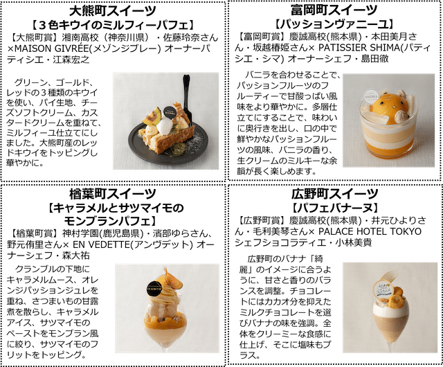 大熊町のキウイ、富岡町のパッションフルーツ、楢葉町のサツマイモ、広野町のバナナをそれぞれ使った4種類のスイーツが味わえます。スイーツは、昨年8月に福島県のJヴィレッジで開かれた各町特産品を使ったスイーツ作りのコンテスト「スイーツ甲子園 ふくしまチャレンジカップ」で、各町賞に輝いた高校生4組と審査員の著名パティシエが考案しました。