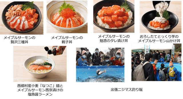 福島県の玄関口に位置し、豊かな自然に恵まれ、首都圏からのアクセスも抜群の福島県西郷村が出店。西郷村は日本の〝村〟としては唯一、新幹線の駅があり、魅力的な観光スポットやおいしいグルメも盛りだくさんです。阿武隈川の清流で丹精込めて育てられた「メイプルサーモン」の海鮮丼のほか、新たにメニュー開発した、「西郷村産小麦『なつこ』麺とメイプルサーモン西京漬けの塩魚醤ラーメン」が新登場します。村の観光名所である「ますつり公園」の出張ニジマス釣り堀もお楽しみください。