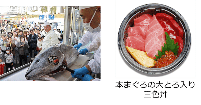 「豊洲かんぺい会」が代々木公園初出店。長崎・鷹島から「生本マグロ」を直送し、毎日「解体ショー」を開催。さばいたばかりの超新鮮なマグロの赤身、中トロ、大トロを食べ比べられる「大とろ入り本まぐろ三色丼」などを提供します。