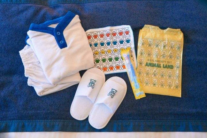もちろん、子ども向けのアメニティも充実。120cmワンサイズのパジャマ、子ども用スリッパ、歯ブラシ、ハンドタオルと、お部屋で快適に過ごせるアイテムがずらり。