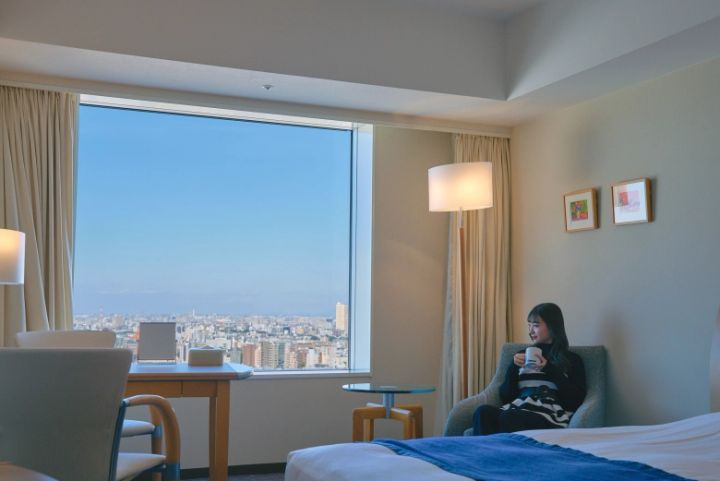 今回すずちゃんが泊まったのは、高層階のツインルーム(東京ドーム側)。落ち着いた色調のインテリアに、東京中を一望できる大きな窓が特徴的です。