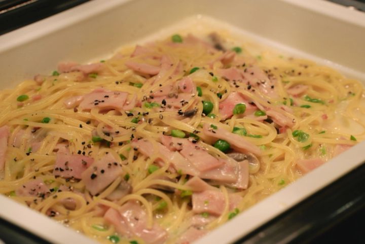 こちらは、ホテル最上階の43階にあるスカイラウンジ&ダイニング「アーティスト カフェ」のシェフが監修した「スパゲッティーニ 生ハムとピゼッリのクリームソース パパリーナ風」という一品。生ハムは程よい塩味でグリンピース(ピゼッリ)も甘くて食べやすく、子どもから大人まで人気のパスタです。