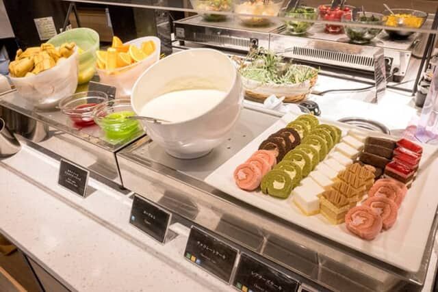 デザートコーナーには一口サイズのいちごケーキやレアチーズケーキ、抹茶のロールケーキが並び、ヨーグルトやフルーツも用意されています。