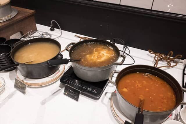 ▲ご飯、味噌汁、卵スープ、ミネストローネが並びます