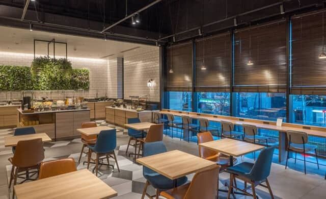 撮影が冬の早朝だったため辺りはまだ暗かったのですが、広い窓のある開放的でスタイリッシュなレストランです。