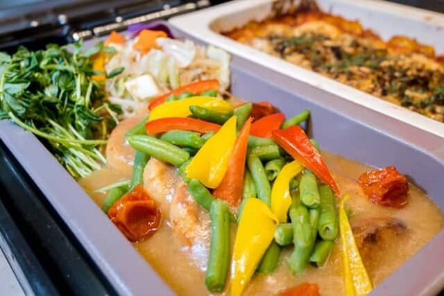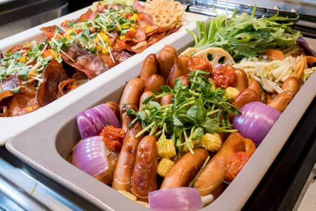 ウインナーとベーコンは、それぞれカラフルな野菜と共に盛り付けられ、ヘルシーに食べられます。グリルされたウインナーは香ばしく、肉の旨味をたっぷりと楽しめました。