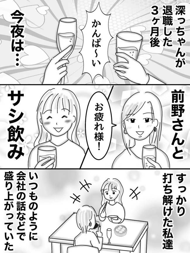 元彼・庭瀬さんと付き合っている同期の深っちゃんが、うつ病になり会社を辞めるといううわさを耳にしたオムニウッチーさん。心配しつつも声をかけられないまま、深っちゃんが退職する日を迎えます。気まずさを抱えながらも最後は笑顔でお別れができた二人。