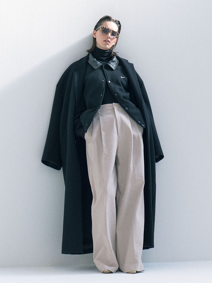 【POINT】黒チェスター+黒ブルゾンのハンサムな装いにやさしさを加えるベージュパンツ。きりっとしすぎない、適度のゆるさと色により、印象はシャープだけど力みがない、絶妙なバランスを形成。たとえ白やベージュと合わせても間のびしない、立体感のあるキレイなルックス。