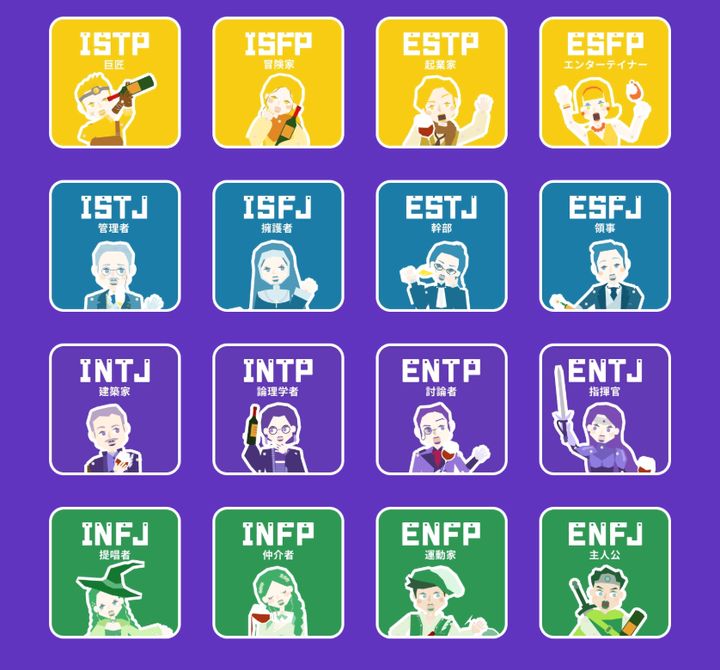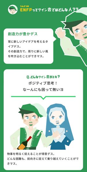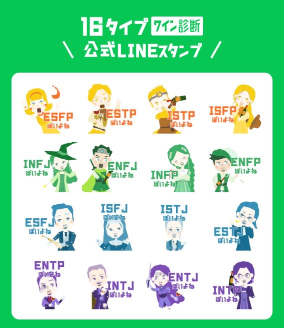 診断結果で、16タイプの個性的な「へべれけキャラ」が登場し、あなたの性格やワインの楽しみ方を教えてくれるので、ワイン初心者の方にも安心♪