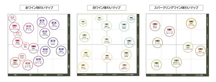 ワインの複雑な味わいを分かりやすく表現するため、「ワイン味わいマップ」を開発。全世界のワインを白13タイプ、赤13タイプ、ロゼ4タイプ、スパークリング8タイプに分類して、色分け、可視化。ワインに詳しくないユーザーでも自分のワインの好みを簡単に表現できるようにした。
