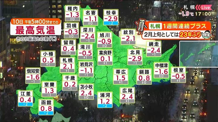 10日の最高気温を振り返ると、9日とほぼ同じ0度前後で、平年並みか2度ほど高くなりました。札幌は2.1度で、1週間連続でプラスの気温になりました。