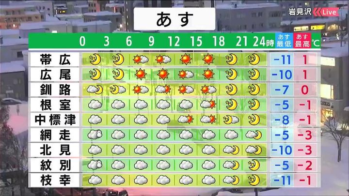 道東は晴れますが、冷たい北風が強まるでしょう。オホーツク海側は雲に覆われ、真冬日と厳しい寒さが続きます。暖かくしてお過ごしください。