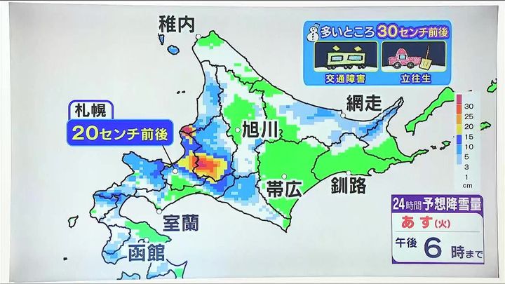 11日夕方までの24時間に降る雪の量です。赤や紫の暑寒別岳周辺、江別や当別、新篠津、岩見沢など南空知の多いところで30センチ前後です。札幌でも20センチくらいのまとまった雪となります。