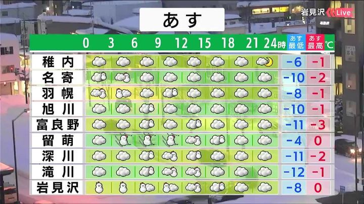 旭川の雪は弱いですが、羽幌は早朝、留萌は昼頃までふぶくでしょう。深川や滝川も昼頃は雪が強まり、岩見沢では大雪となるおそれがあります。