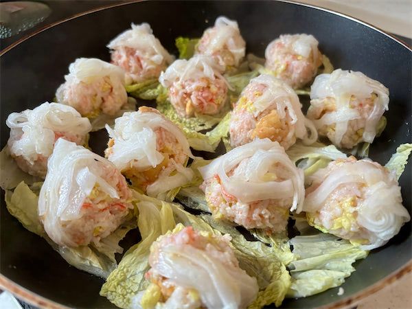 4. 3を12個に分け丸めて、1の白菜にのせます。