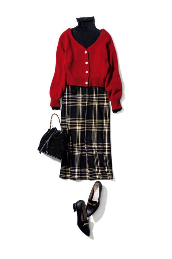 チェック×ローファーでトラッドに。黒できりっと引き締めれば赤の魅力がさらにアップ!