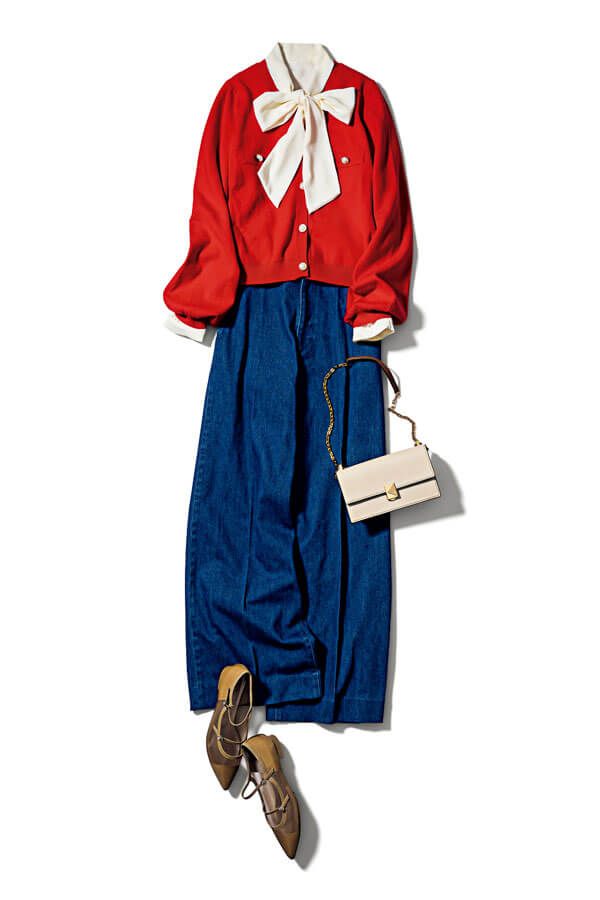 赤カーデの下にレイヤードしたボウタイブラウスで、清楚な華やぎをプラス。