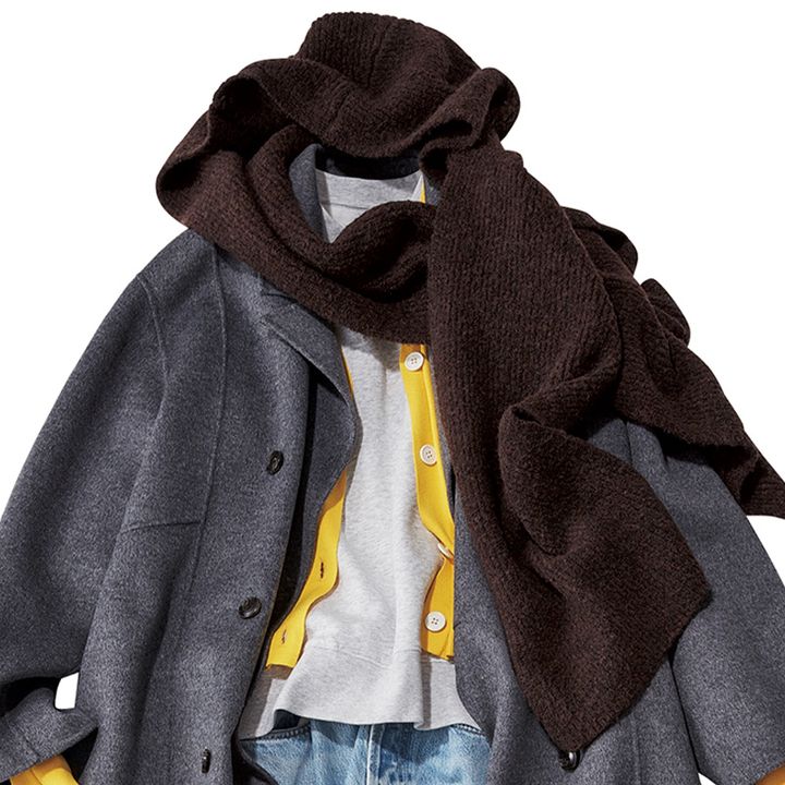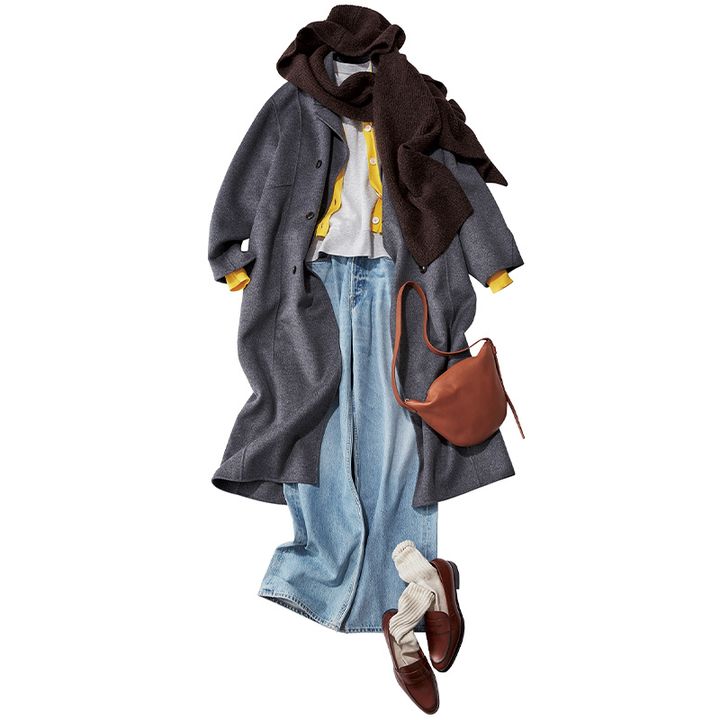 コート¥50,600(FRAY I.D/FRAY I.D ルミネ新宿2店)カーディガン¥29,700(エンフォルド)ニットマフラー¥6,930(スタイルミキサー/バロックジャパンリミテッド)スウェット¥1,990(無印良品/無印良品 銀座)パンツ¥52,800(シチズンズ・オブ・ヒューマニティ)バッグ¥37,400(バケット バゲージ/アイネックス)シューズ¥39,600(ジャランスリウァヤ/ジャランスリウァヤ 日本橋)靴下/スタイリスト私物