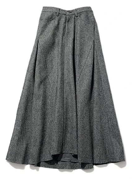 自然な広がりとキレイに動きが出るヘムライン&ハイウエストのロングは身長の低い私にもぴったり。ボトムはしっかり吟味して、長く着られる上質でシンプルものを選ぶのが必須。なので私のボトムワードローブは毎シーズン、毎年変わらず穿いているものばかりです」(岩田さん)