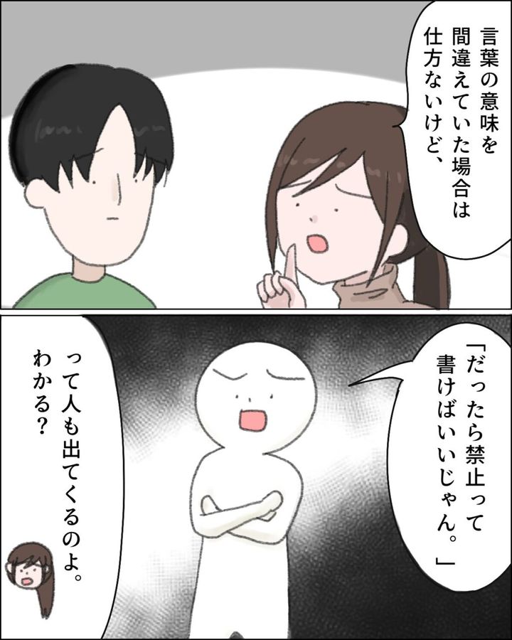 「言葉の意味を間違えていった場合は仕方ないけど『だったら禁止って書けばいいじゃん』って人もでてくるのよ。わかる?」と聞きました。
