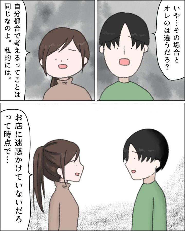 「自分都合で考えるってことは同じなのよ。私的には。お店に迷惑かけてないだろって時点で・・・」
