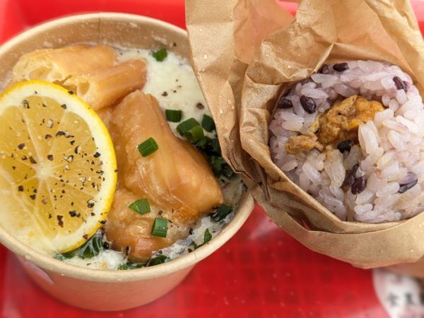 鹹豆漿は、特製調味料に国産豆乳を加えて仕上げていきます。混ぜてトロトロになったら出来上がり!紙に包まれたおにぎりも出して、いただきま~す。