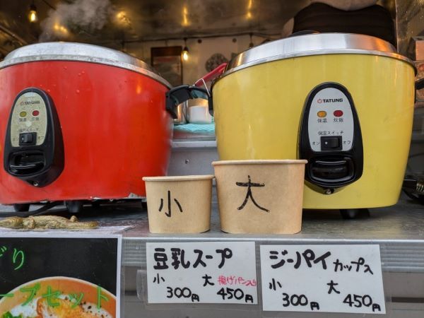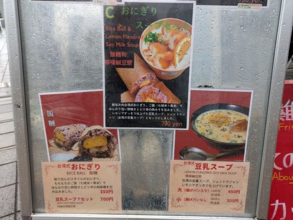 飛行機の乗り継ぎで1日だけ台湾に滞在したことが2回あり、1日中台湾グルメを楽しんだ私ですが、この食べ物には出会っていなかった~、というこちらのメニューを今回いただいてみました。鹹豆漿(セントゥジャン)(揚げパン入りの大サイズは450円、揚げパンなしの小サイズは300円)という台湾式豆乳スープと、飯糰(ファントン)(350円)という台湾式おにぎりです。
