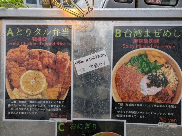 丼ぶりもののメニューは2種類あり、台湾の士林夜市にある、豪大大鶏排の鶏排を参考に仕上げたという「とりタル弁当」(750円)は、台湾産タピオカ粉を纏わせて揚げたジーパイ(台湾からあげ)を乗せ、あっさり味の卵のタルタルとつぼ漬、ピクルスをトッピングしています。 「台湾まぜめし」(750円)は、自家製の特製旨辛ミンチに、オリジナルスパイスと薬味をたっぷり乗せた、スパイシーで色々な食感が楽しめるご飯です。