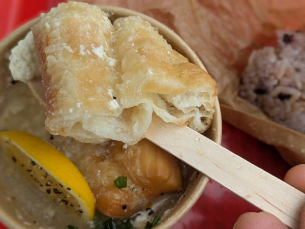 豆乳のスープはさっぱりして、とってもヘルシーな感じです。現地ではお酢を使用して豆乳を固めているそうですが、オーナーさんはそれよりも日本人好みであろうと思ったレモン汁を使っているので、爽やかな香りが特徴のスープに仕上がっています。熱々のお豆腐はトロトロで、容器に満杯入っているので食べ応えもありますよ。 揚げたての油條(ヨウティアオ)は、表面はカリっと、中はジュワっとスープを吸っているので、食感が面白いです。2個入っているのですが、最後の方はさらにジュワっとしていて、スープの味と相性が抜群でした。