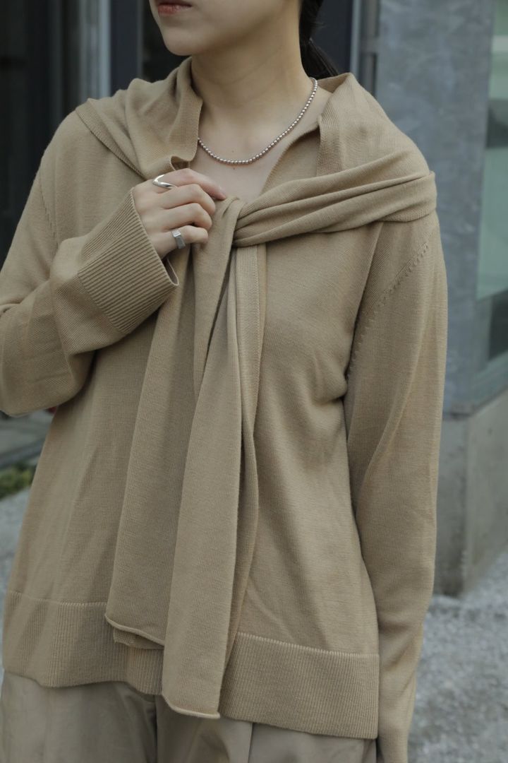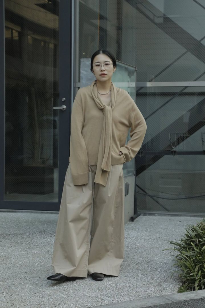 「一枚で洒落た着こなしが手に入るタイ付きのニット。ハイケージ編みならではの落ち感がキレイで、こなれ感のあるスタイリングに」トップス¥71,500 (バイ・マレーネ・ビルガー/ショールーム ロイト)