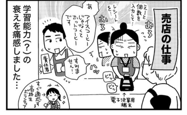 難しい仕事ではないのですが、パパッと動くことができなかったり、ホットコーヒーとアイスコーヒーを打ち間違えたり、なんだか瞬発力とか学習能力みたいなものが衰えているなあと痛感しました。