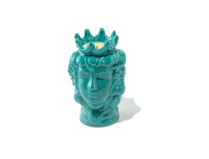 王冠をかぶった人をモチーフにしたセラミック素材のキャンドルは、イタリアのシチリアで作られたもの。オリエンタルな香りをベースに、地中海の白い花をイメージしたパフュームを楽しめる。
