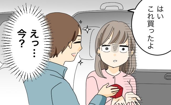 そして、待ちに待ったその日が。なんと、引っ越し先の物件を掃除しに行こうと、彼と一緒に車に乗ったタイミングで「はい、これ買ったよ」と、ポイッと婚約指輪を渡されたのです……。